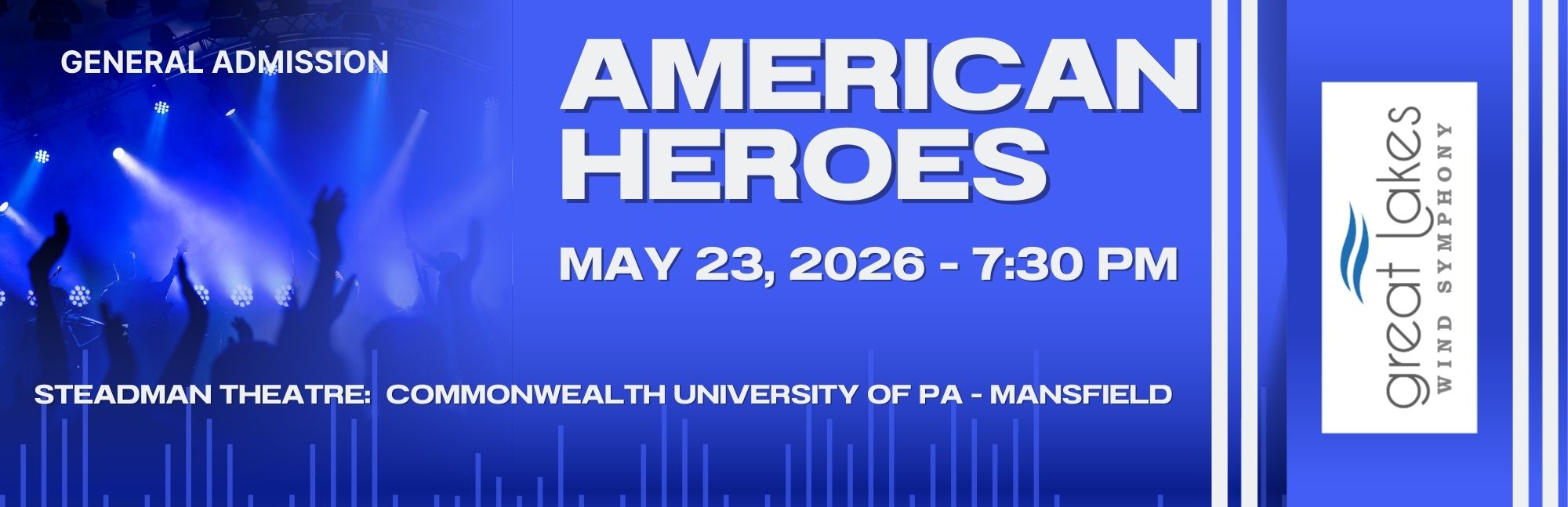 Concert Tickets for the American Heroes” Memorial Day Salute Concert by the Great Lakes Wind Symphony on Saturday, May 23, 2026 at 7:30 pm in Steadman Theatre on the campus of Commonwealth University of PA- Mansfield. Children under 12 admitted free as are individuals with Exceptionalities. Active Duty Service Members and US Military Veterans with appropriate Identification are admitted Free. Your Tickets will be delivered to your e-mail used when purchasing them. Be sure to check your SPAM folder for a message from ThunderTix if you do not see them in your inbox! Contact [email protected] with questions.